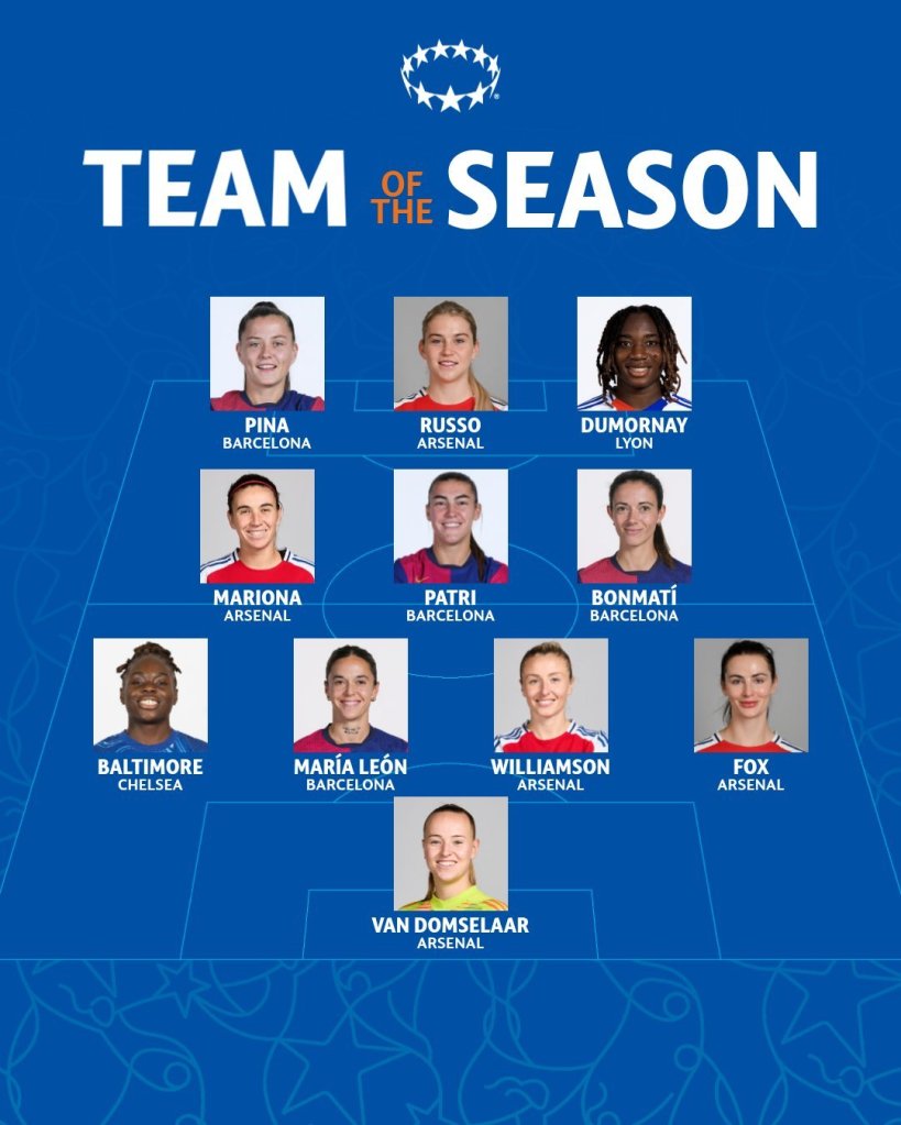 A UEFA revelou o onze da temporada da Liga dos Campeões 2024/25 e o Arsenal, coroado campeão europeu, é o grande destaque com cinco jogadoras no onze ideal!