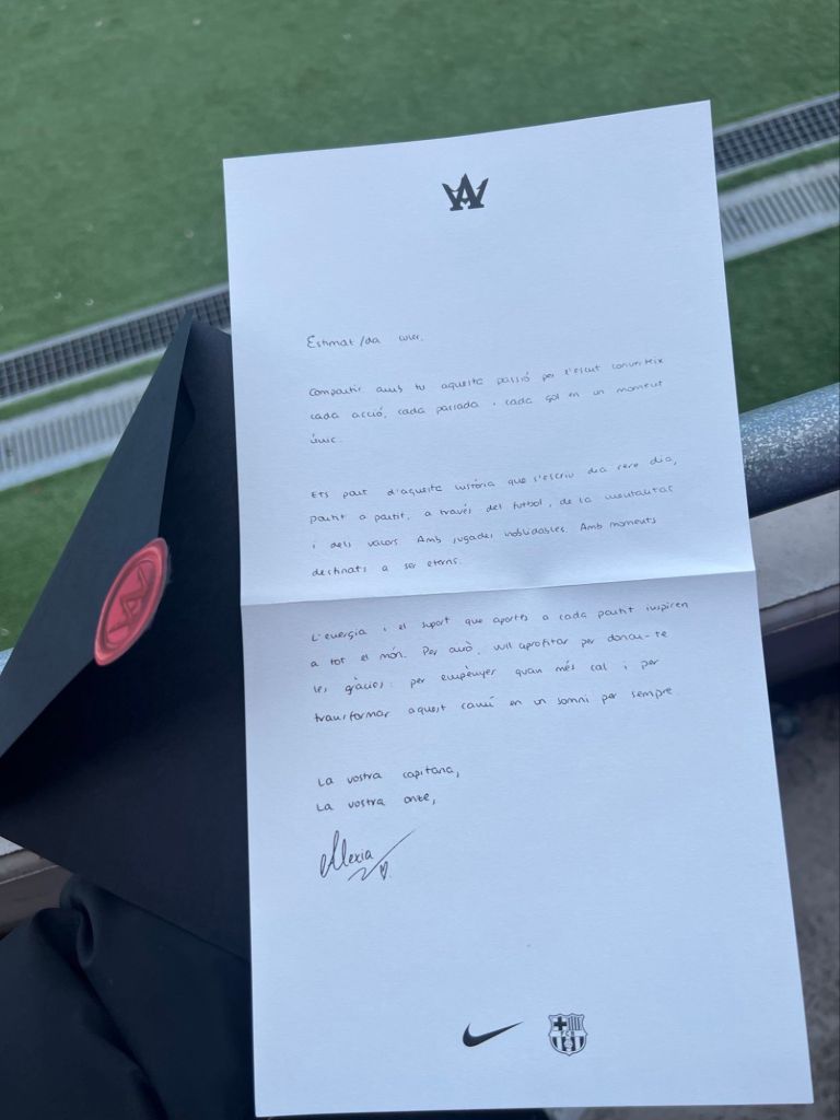 No jogo de hoje, cada adepto presente no Estádio Johan Cruyff encontrou no seu lugar um envelope negro, discreto mas carregado de significado. Selado com o logótipo pessoal de Alexia, criado em conjunto com a Nike e estampado a vermelho, o conteúdo guardava uma breve mensagem de agradecimento, um gesto íntimo de quem reconhece que o caminho nunca se faz sozinho.